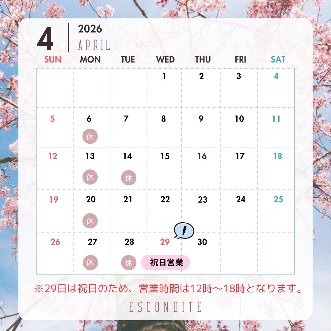 定休日 4月スケジュール 2026.04.07 この記事のタイトルとURLをコピーする 遅くなりましたが、4月のスケジュールです。 29日は祝日営業となります。 よろしくお願いいたします。 Post Share Hatena Pocket RSS feedly Pin it